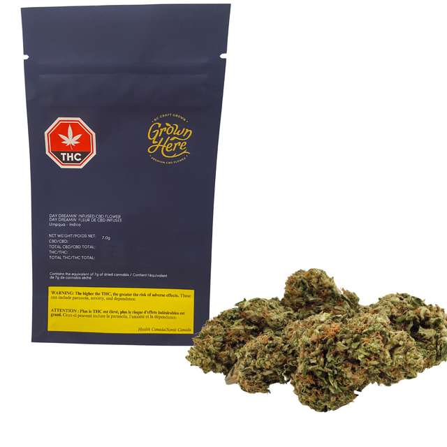 Enjoy the tranquil yet uplifting effects of our organically grown BC craft Day Dreamin’ Infused CBD Flower proudly cultivated by Grown Here Farms.